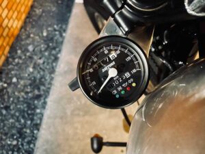 スピードメーターは、デイトナのものを専用のステーでフォークマウントにしました。